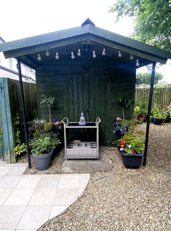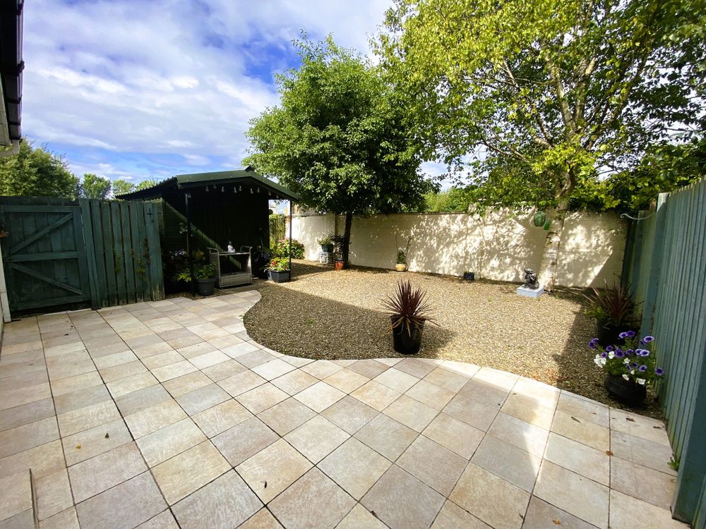 Beautiful garden to the rear with paving, shingle and shed, mature trees.