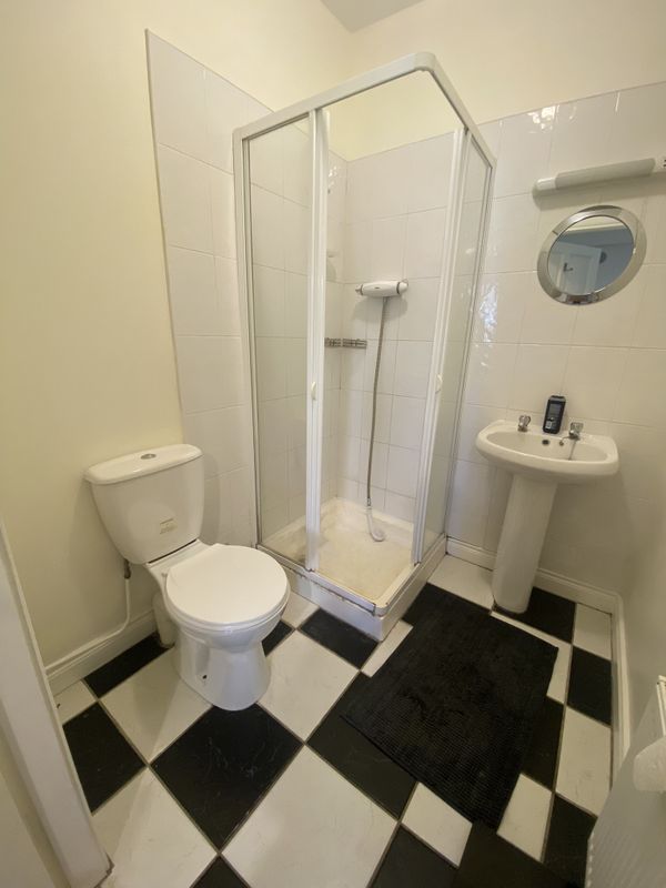 Generous en-suite with ceramic floor and part wall tiling, white sanitary ware, light fitting, shaver light and wall mounted mirror.